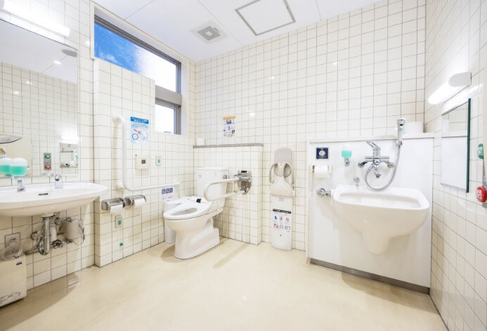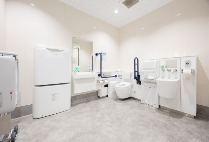 1階フロアに設置。車椅子の方や、小さなお子様連れの方も安心して利用できる十分なスペースを確保しています。また、オストメイトのご用意もございます。