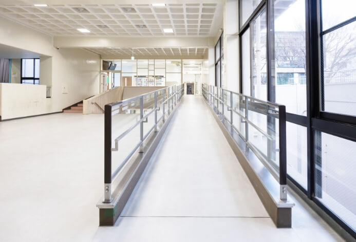 卓球場・トレーニングルームと、主競技場を繋ぐ中スロープで、車椅子やベビーカーの方も安心して上り下りいただけます。