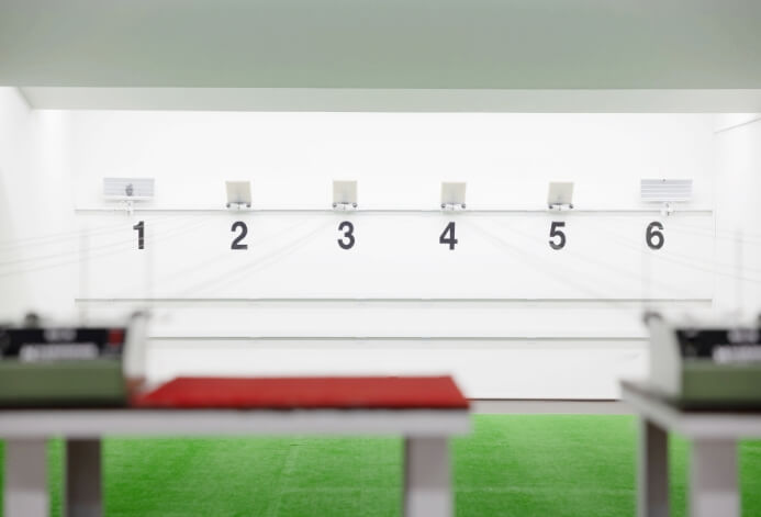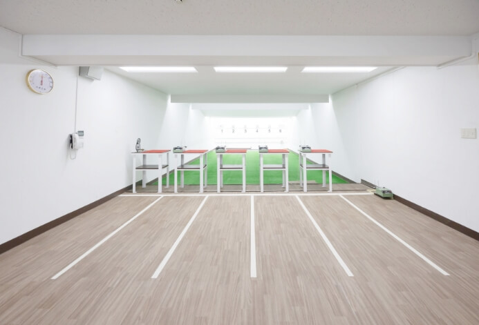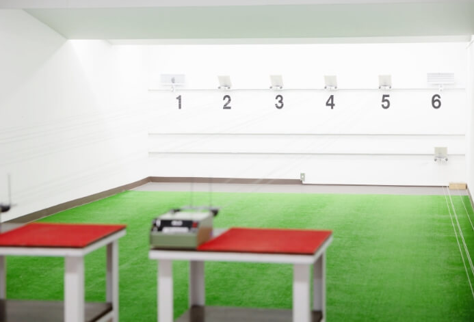 50mの距離を確保した、開放感あふれる本格的な屋内専用射場です。
