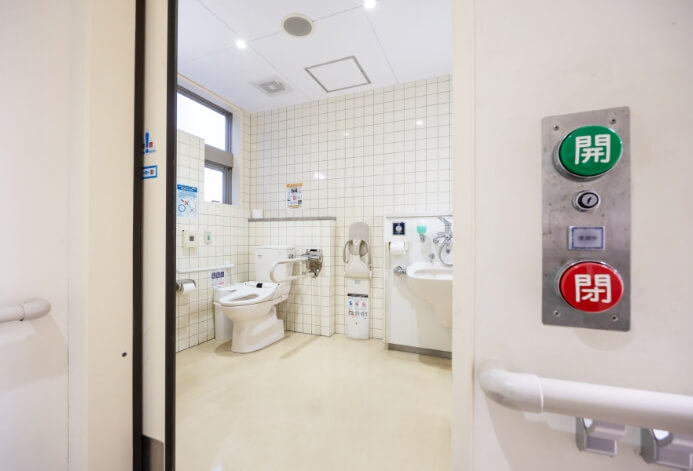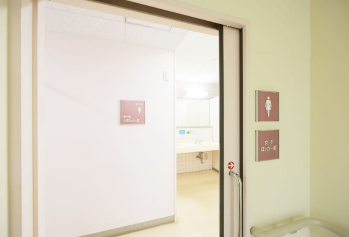 移動がスムーズな引き戸式の「ロッカー室」をご用意。手すりを備えた広々とした「多目的トイレ」完備しており、オストメイトのご用意もございます。