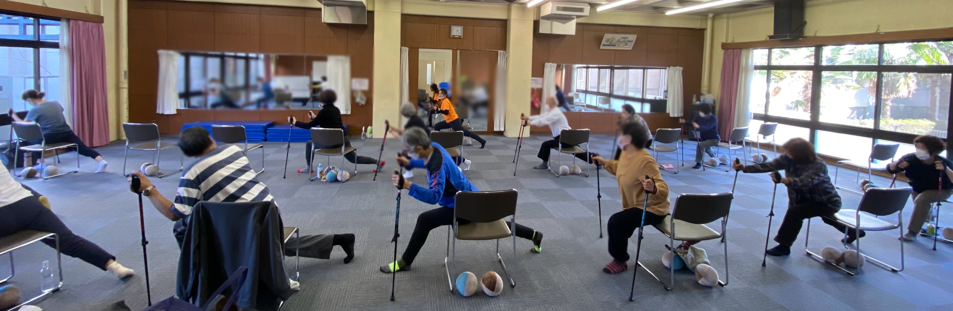 ノルディックポールストレッチ&トレーニング※1やボルレッチ※2の手具を使用し、イスに座っての運動が中心となります💺