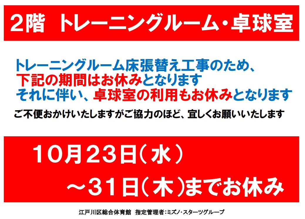 全館休館のお知らせ及びトレーニングルーム・卓球室利用中止のお知らせ