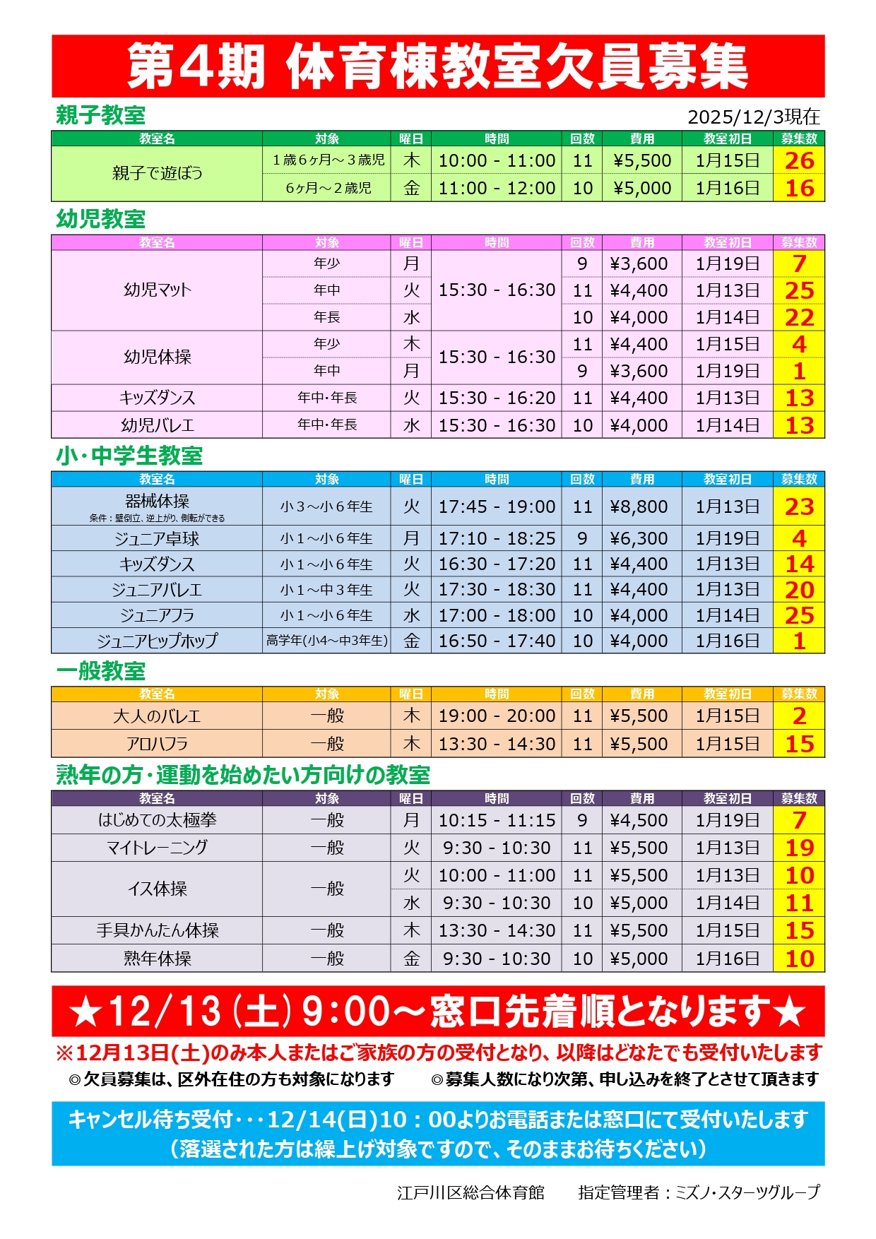 令和7年度1月~3月開催の第4期体育棟募集制教室の欠員募集を行います!