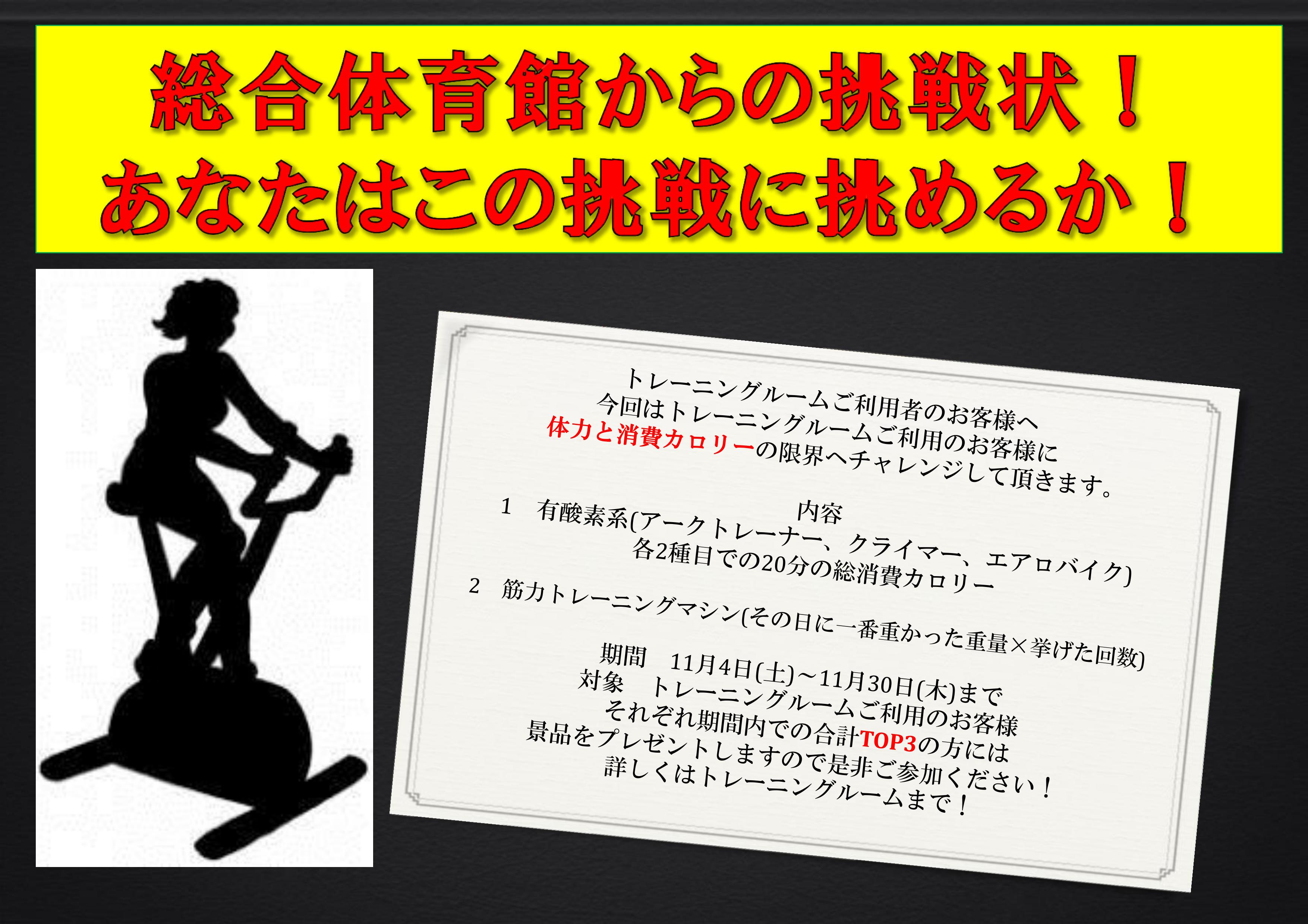 11月4日(土)~11月30日(木)までトレーニングルームにて“体力と消費カロリーの限界”にチャレンジしていただきました。