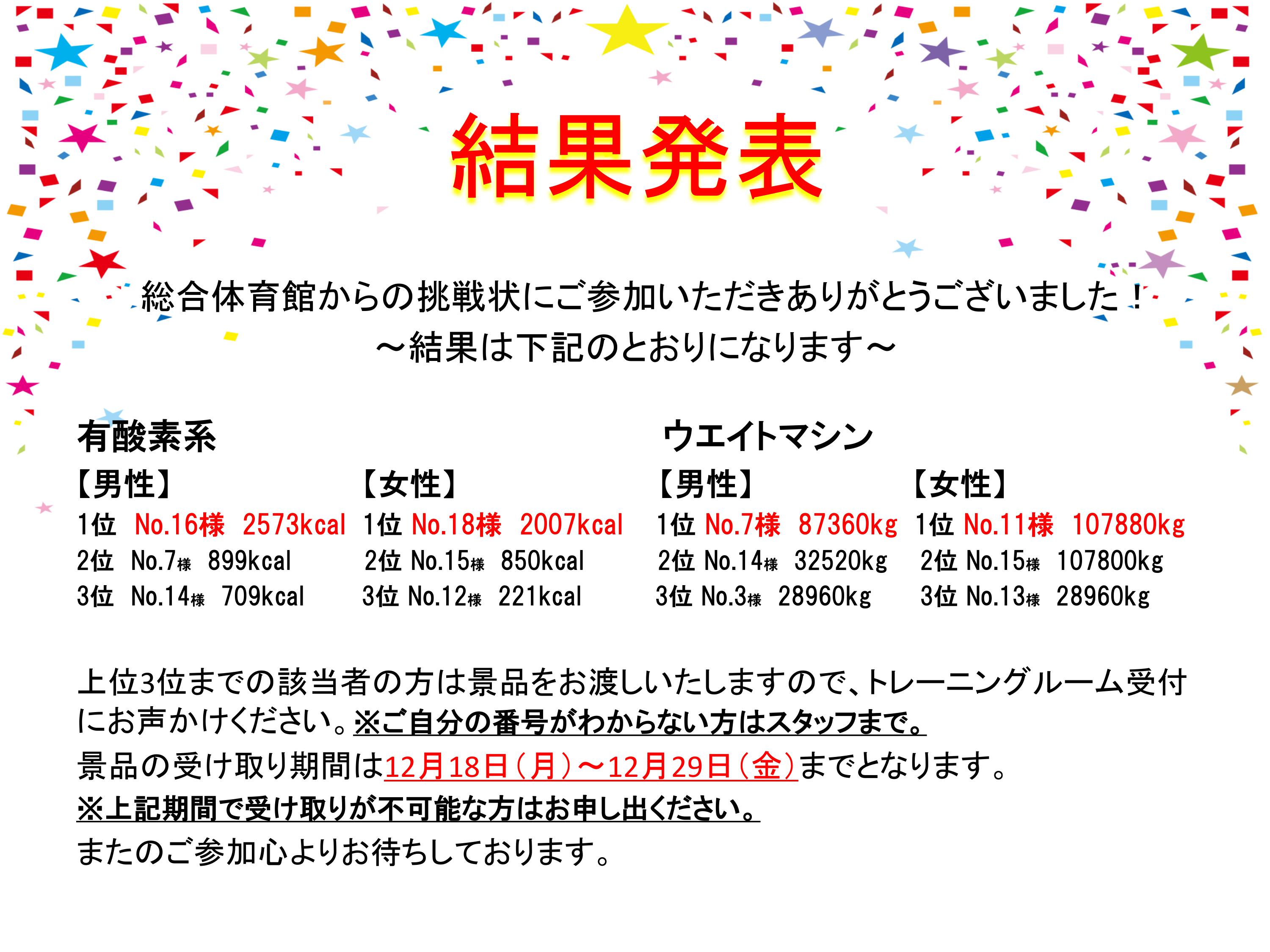 有酸素運動マシンでは消費カロリーを、筋力トレーニングマシンではその日に一番重かった重量×回数を期間中に加算していき、上位TOP3の方を選出しました。
