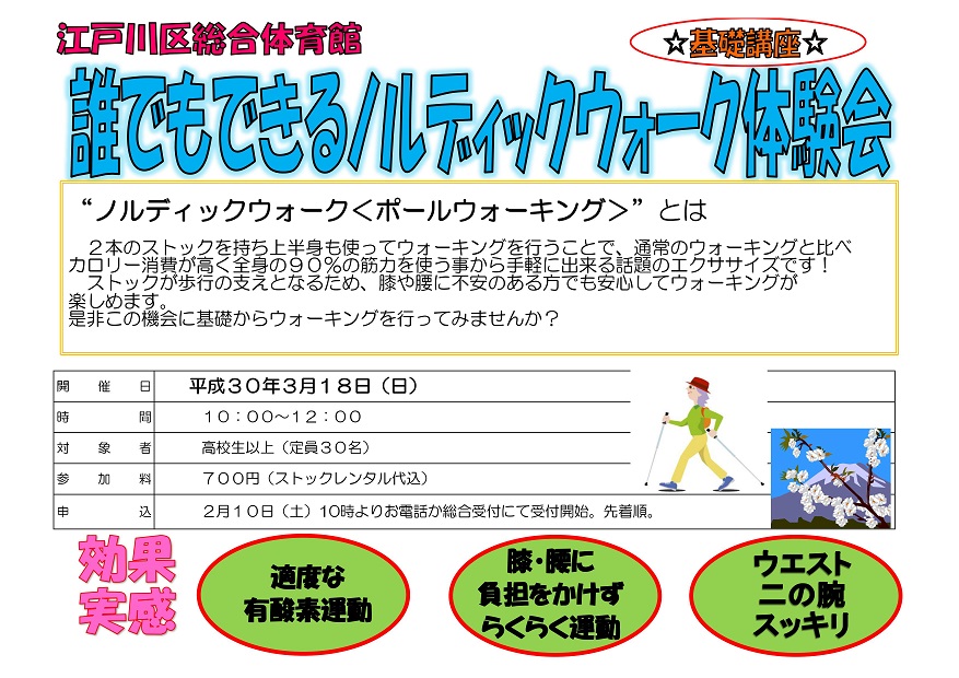 2018年3月18日(日)江戸川区総合体育館にて『誰でもできるノルディックウォーク体験会』を開催しました。