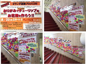 江戸川区総合体育館ではこのオランダ連携プロジェクトを皆様に知っていただくため、オランダの国花であるチューリップを総合体育館利用者に折っていただきお花畑を作っています。