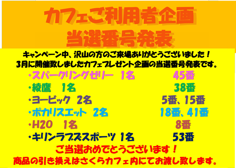 お待ちかねのプレゼント企画の当選番号発表致します!