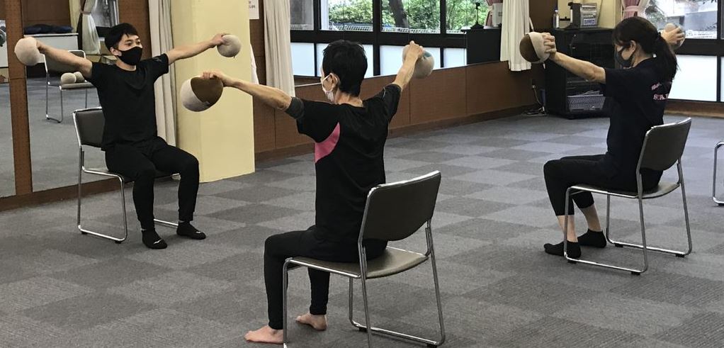 ボルレッチを使って肩回りのストレッチ、ゆらゆらクッションにのって腰回りをほぐします。