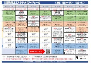 8月11日(木・祝)~17日(水)スタジオレッスンのご案内です。