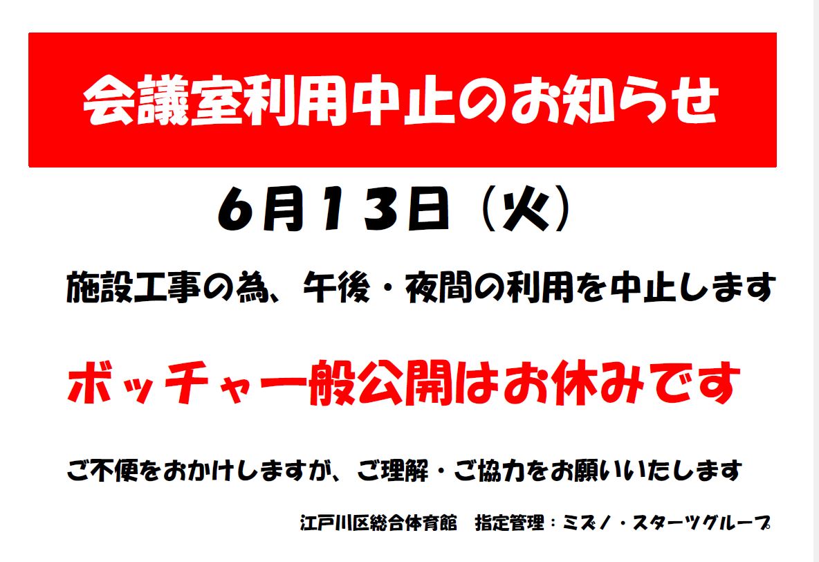6月13日(火)は施設工事の為、会議室の午後・夜間の利用を中止します。