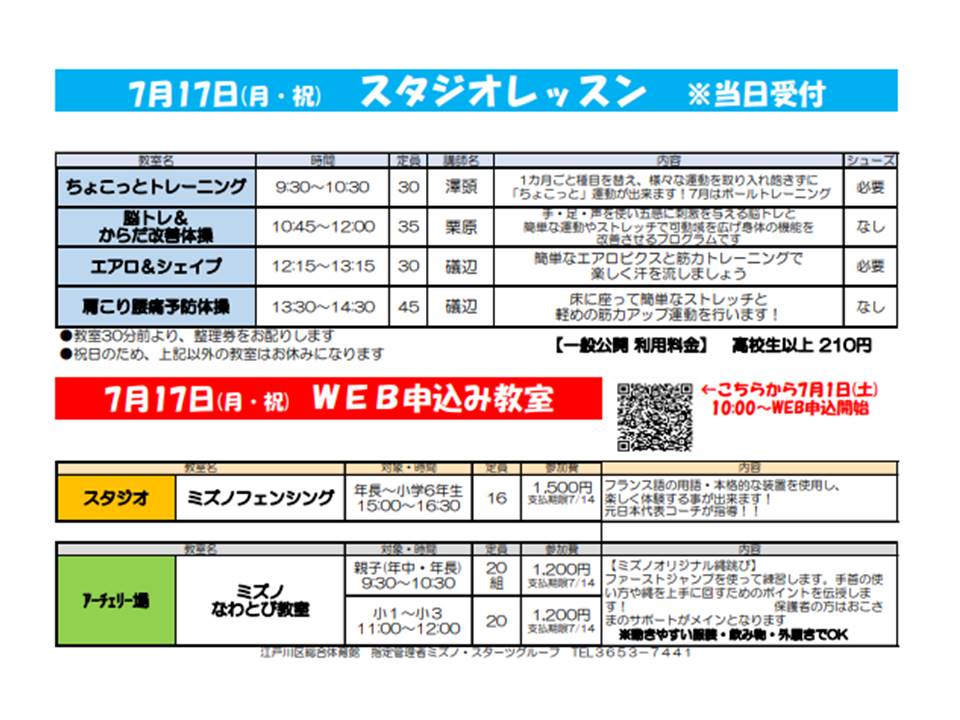 【令和5年度】7月17日(月・祝)海の日スタジオレッスンのお知らせ