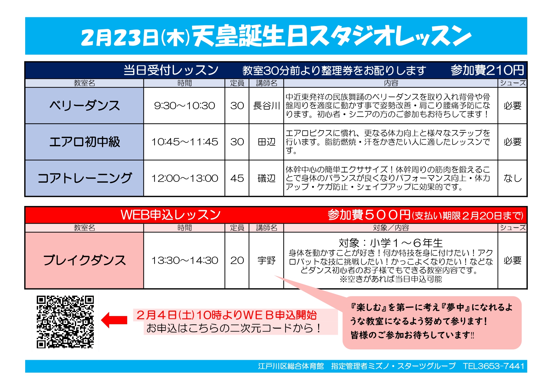 【2月23日(木・祝)天皇誕生日スタジオ特別レッスンのお知らせ】
