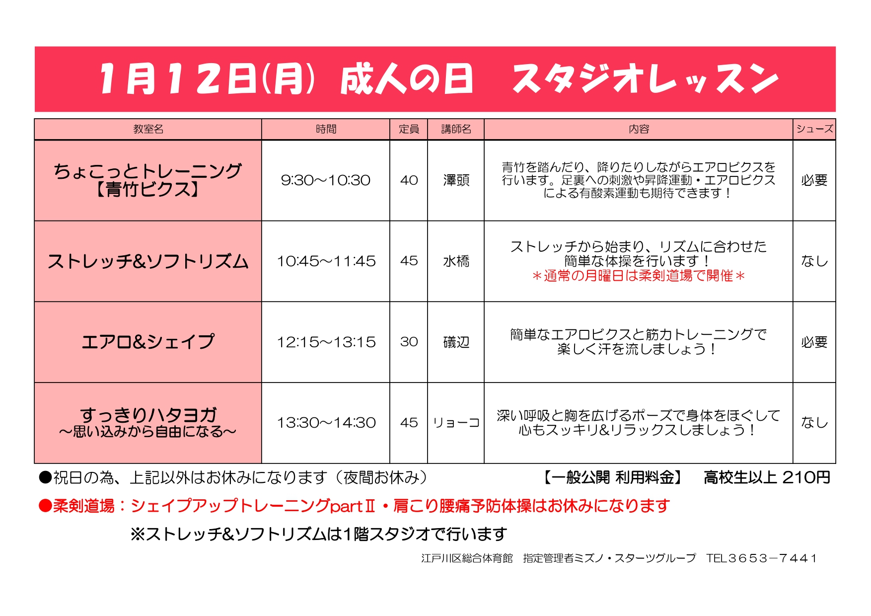 【1月12日(月・祝) 成人の日】スタジオレッスンのお知らせ