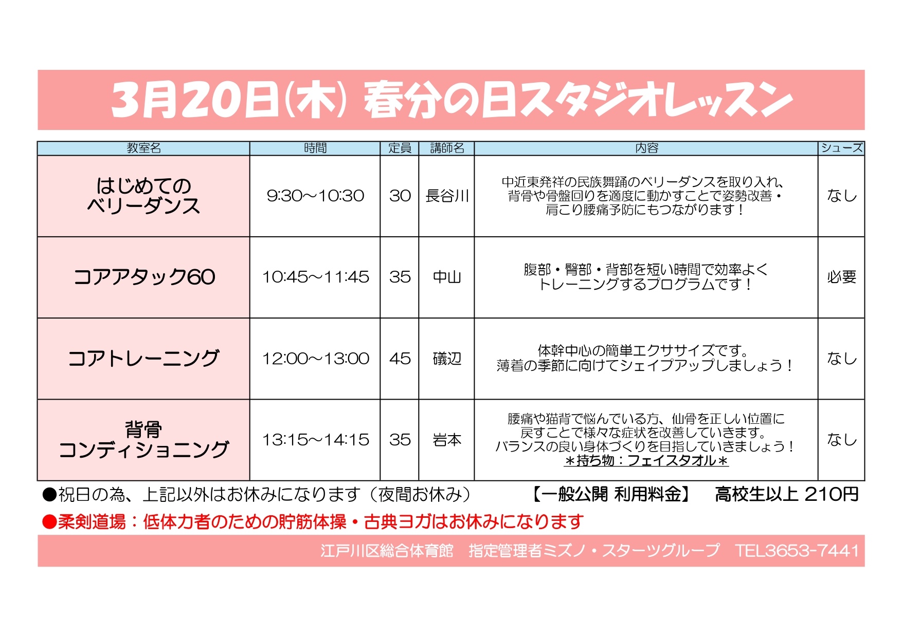 【3月20日(木祝)春分の日】スタジオレッスンのお知らせ