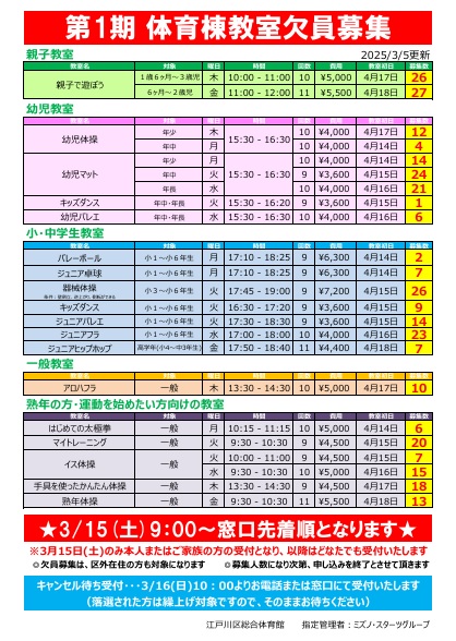 【令和7年度 第1期体育棟募集制教室】 欠員募集のお知らせ